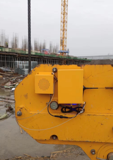 塔式起重机是工地施工不可或缺的重要设备之一,随着设备保有量的日益增加, 塔机安全事故也屡有发生。如何有效的杜绝或避免安全事故的发生也成为了各施工 单位与安全主管部门的重要工作之一。实用高效稳定的科技类安全警示产品成为了 现目前各施工单位避免安全事故发生的主要手段。 塔机一般在司机室下方安装有警示喇叭,用于警示地面人员注意安全。但是随 着塔机高度的增加,该喇叭的作用略显鸡肋,高度太高声音无法传递很远。塔机在 夜间施工工况下,吊钩无法被目视,指挥人员也只有在吊钩接近地面时才能知道具 体落钩位置。这在夜间施工是一个比较大的安全隐患。 塔机吊钩声光警示,安装于吊钩上,具有灯光与声音警示,可由司机或地面指 挥遥控操作。灯光警示由红蓝双色 LED 灯,交替闪烁亮灯,设置有光敏传感器, 夜间自动点亮。警示喇叭由无线遥控操作,真人发生,可达 120 分贝音量,在吊钩 距离地面 15 米处亦能清晰听清警示语音。 当司机踩下脚踏开光或者地面指挥人员按下遥控器,喇叭自动发生“吊钩起落, 请注意安全”,警示地面人员。