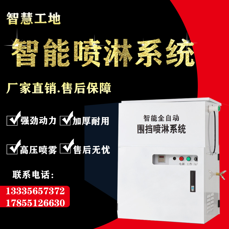 工地围挡喷淋系统主要由PPR水管、直通、三通、弯头等组成水流通的管路,水箱提供喷淋水源,多级泵给予输送动力,智能控制器控制整个系统。