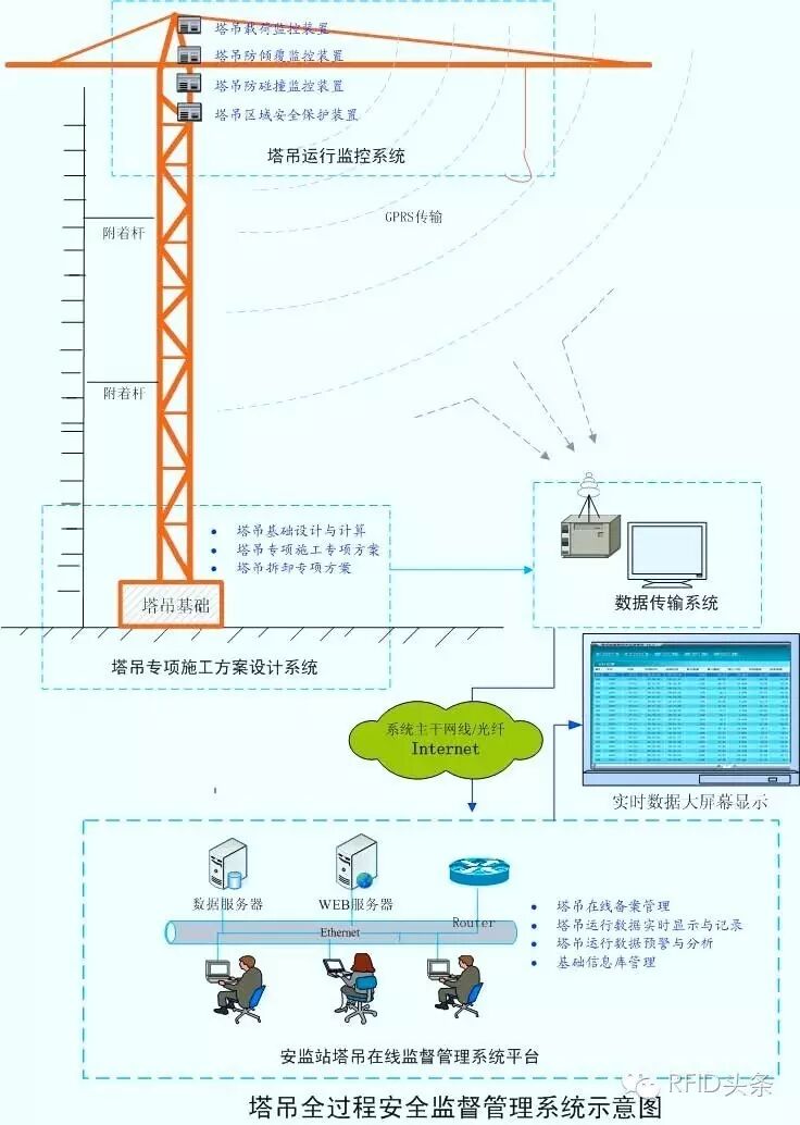 塔吊全过程安全监控管理系统是指从塔吊基础设计开始,到塔吊完全拆除为止的使用生命周期当中,通过互联网技术手段进行塔吊安全备案管理、塔基设计与施工方案编制、塔吊作业过程监控和记录的一整套安全监控管理系统。