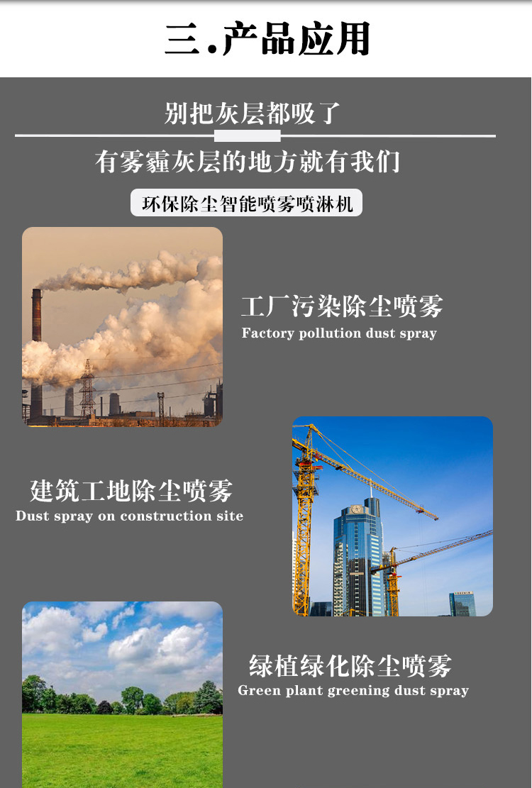 其是对大型开阔范围的控尘降尘有很好的效果,同时由于喷射完全是雾化效果,绝